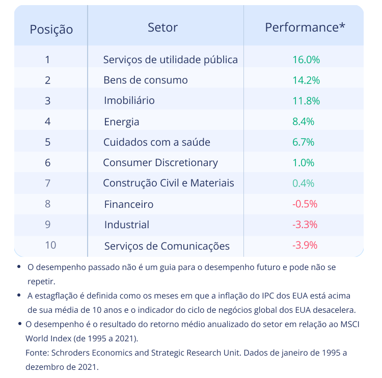 A tabela abaixo mostra o retorno histórico médio de 10 setores econômicos globais em comparação com o MSCI World Index durante a estagflação. A história tem nos mostrado que vários setores podem ter um bom desempenho na estagflação.