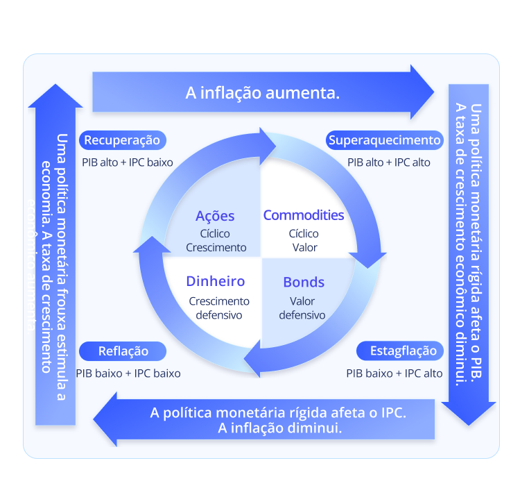 O ciclo econômico pode ser separado em quatro fases: reflação, recuperação, superaquecimento e estagflação, com base no nível de dois indicadores econômicos: taxa de crescimento econômico e taxa de inflação.