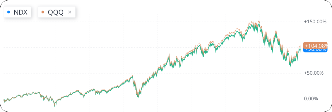 - Entre os vários ETFs que acompanham os índices da Nasdaq, o mais famoso é o $Invesco QQQ Trust. Ele acompanha o índice Nasdaq-100 (NDX), que compreende 100 das maiores empresas não financeiras incluídas no índice Nasdaq Composite. Atualmente, é negociado a aproximadamente 1/40 do valor do índice Nasdaq-100. Nos últimos 4 anos (julho de 2018 a julho de 2022), o QQQ acompanhou de perto os movimentos do índice Nasdaq-100.