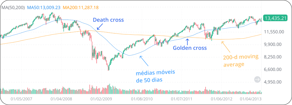 Muitos analistas técnicos usam a média móvel de 50 dias e a média móvel de 200 dias para identificar tendências de longo prazo. O sinal de cruzamento identificado é chamado de cruz dourada ou cruz da morte.